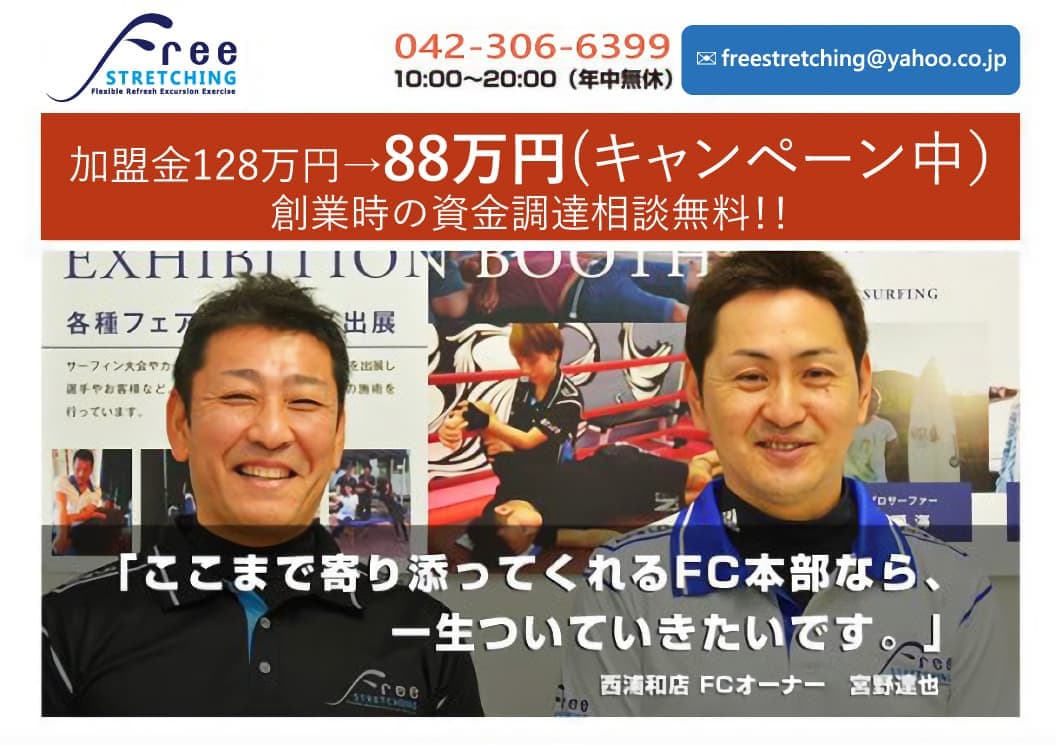 もちろんFC本部と加盟店様の間で最低限の取り決めはさせて頂きますが、時間や定休日・営業時間は勿論のこと、様々なアイデアで独自のフリーストレッチングを作り上げて頂きたいと考えています。